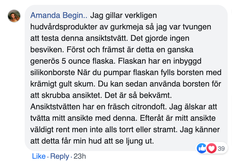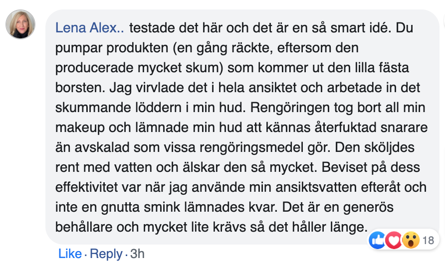 "Jag har bara använt denna rengöring i två veckor och jag kan redan se en stor skillnad. Min hud känns slätare och har en naturlig lyster. Den har också hjälpt mot de mörka fläckarna på kinderna. Jag har provat så många produkter, men den här är överlägset bäst Älskar att den är skonsam och fungerar så snabbt."